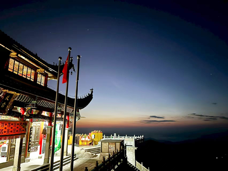 海拔 1306 米峰頂的天臺寺,則是高山玄寺的代表。寺院始建于宋代,后經多次重建修整,巧妙借助山梁凹陷處構造,與周邊峰、石、洞融為一體。站在天臺寺前,遠可眺望黃山、長江,近可俯瞰整個九華街,百歲宮亦在腳下。其優越的地理位置與精妙的建筑構思,令人贊嘆不已。